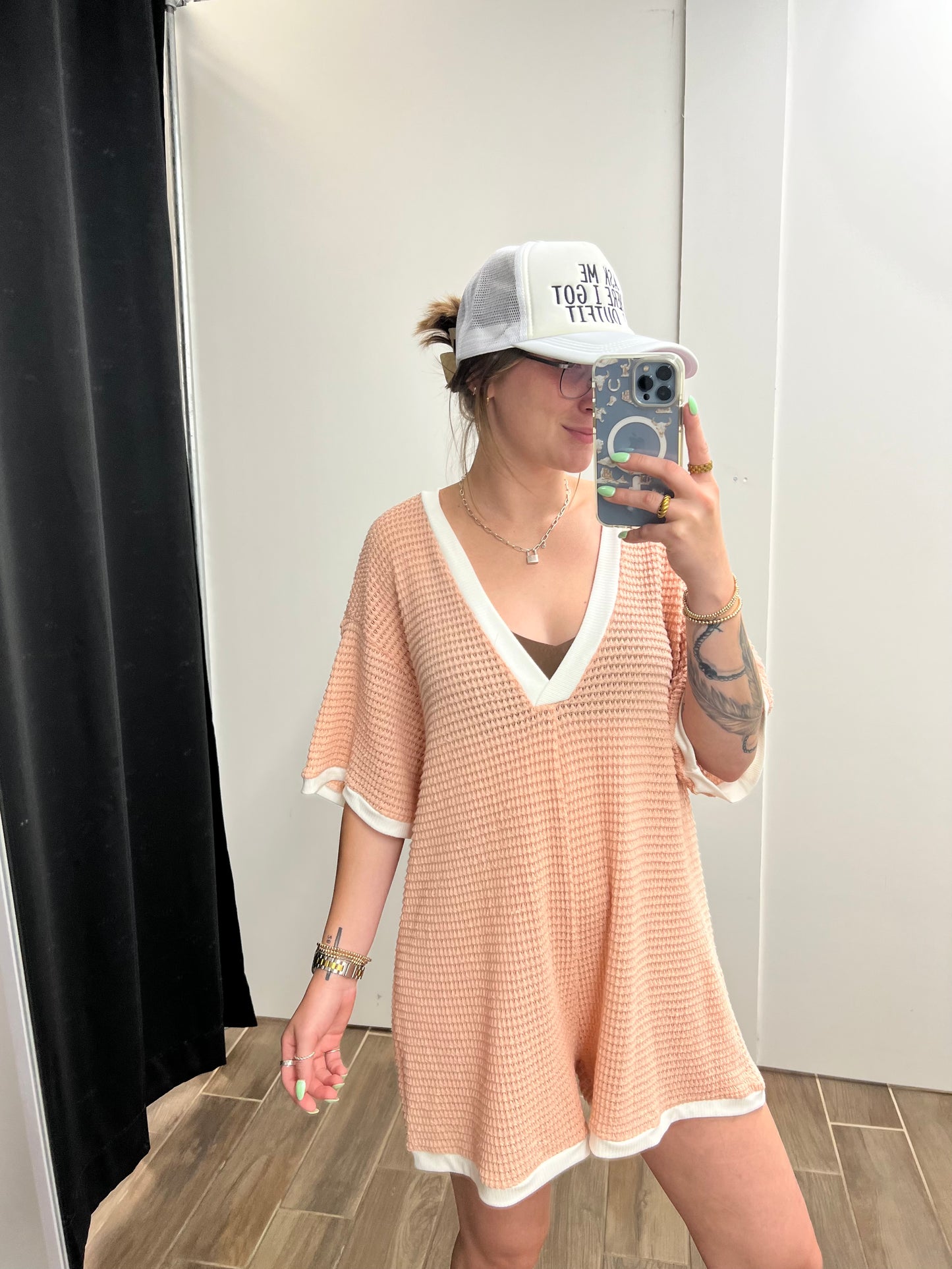 Where comfort meets carefree coastal vibes. The Bayside Dreams Romper is your new go-to for beachy mornings, lazy afternoons, and everything in between. This oversized romper is made from a cozy waffle knit with a breezy drape, giving you that relaxed look without sacrificing style. Contrast trim and a flattering V-neckline add a pop of polish, while the roomy fit makes it perfect for throwing on and heading out the door.