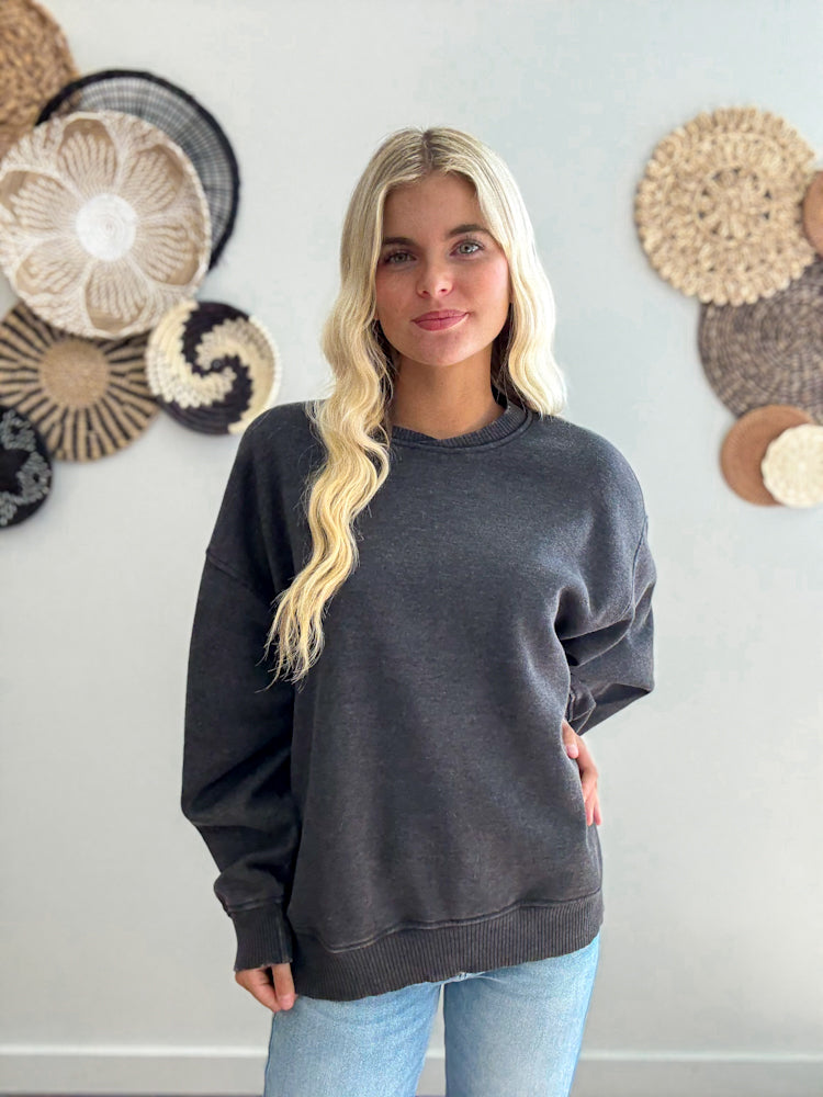 The Blackout Comfort Crew is an acid wash fleece pullover featuring a roomy oversized fit, statement balloon sleeves, and a flattering overlap neckband. Crafted from a super soft blend of 60% cotton and 40% polyester, it’s cozy without feeling bulky and designed for all-day comfort. Each piece is uniquely dyed for that perfectly worn-in look, making every pullover one-of-a-kind.