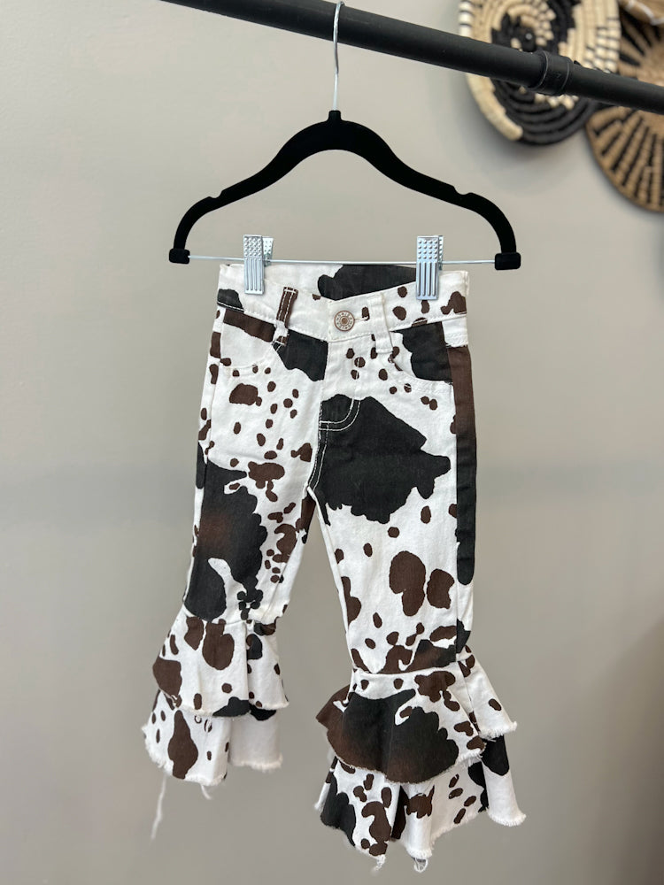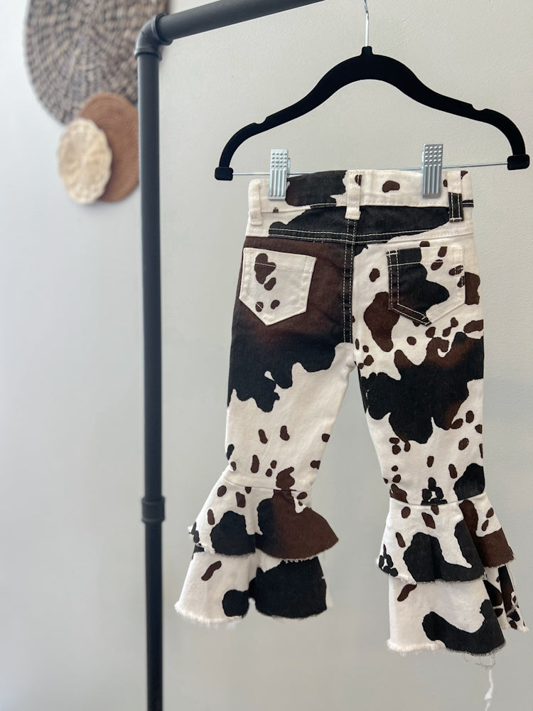 Calling all rodeo mamas — the Cowbabe Denim Baby Flare is the ultimate western-wild statement piece for your little one's closet. Featuring a bold cow print, double-layered flares, and the perfect amount of stretch, this pair was made for twirling into the spotlight.