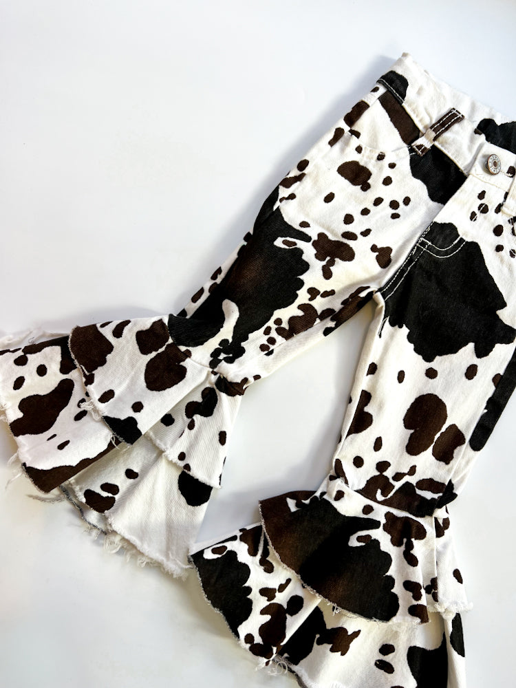 Calling all rodeo mamas — the Cowbabe Denim Baby Flare is the ultimate western-wild statement piece for your little one's closet. Featuring a bold cow print, double-layered flares, and the perfect amount of stretch, this pair was made for twirling into the spotlight.