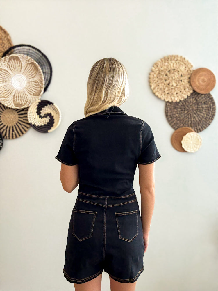 Crafted from washed black denim with contrast stitching, this fitted romper features a zip-front closure, collared neckline, short sleeves, and utility-inspired front pockets. The curve-hugging silhouette adds bold edge while keeping it versatile and wearable.