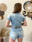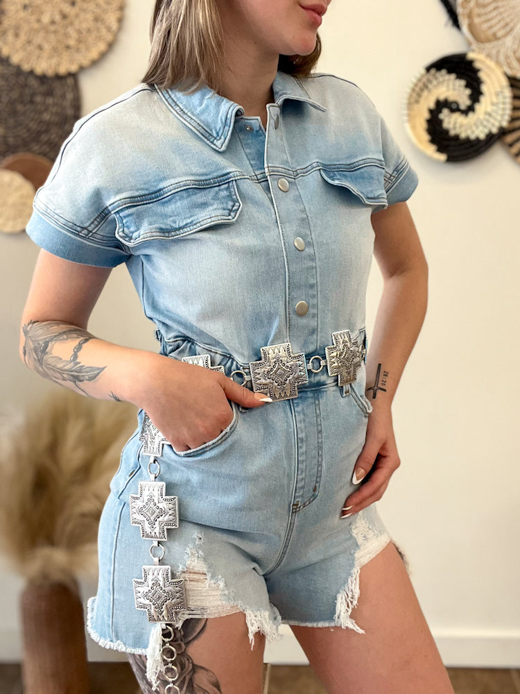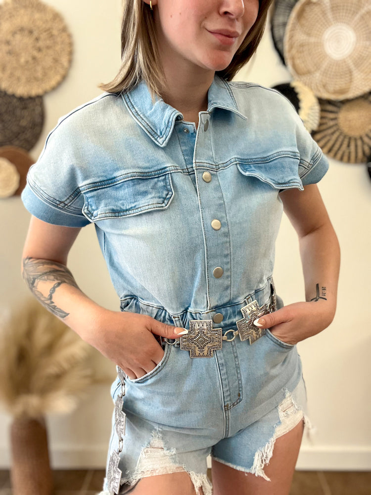 For the girl who’s always on the go but still wants to turn heads — the Destined for Denim Romper is your new ride-or-die. Whether you're wrangling kiddos, headed to a country concert, or just running downtown, this one-piece wonder is made to move with you and look dang good doing it.