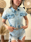 Crafted from a cotton-rich blend with 92.5% cotton, 6% polyester, and 1.5% spandex, this romper offers extreme stretch and a seriously flattering fit. It hugs in all the right places, stays true to size, and feels like your favorite broken-in denim — minus the stiffness. Sized just right: XS (fits 0/2), S/M (fits 4/6), L/XL (fits 8/10/12), 1X (fits 14/16), 2X (fits 18/20), 3X (fits 22/24).