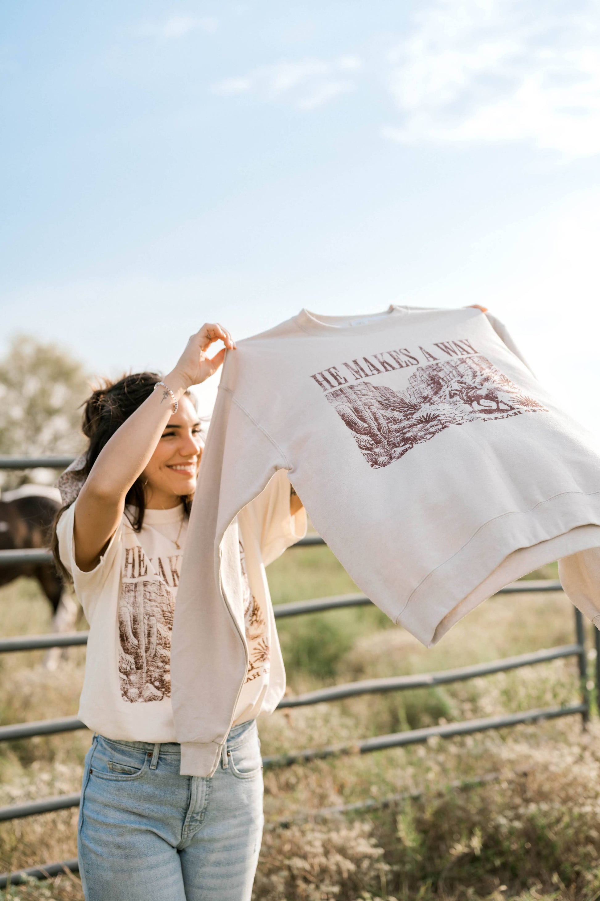 “Behold, I am doing a new thing; now it springs forth, do you not perceive it? I will make a way in the wilderness and rivers in the desert.” Isaiah 43:19 Your story is no exception to the promise of who Jesus is as the Waymaker. If you are faced with a seemingly impossible circumstance, remember that there is nothing impossible for Him. The One who makes a way in the wilderness goes before you. The One who makes rivers and streams in desert places is working on your behalf. He has your world in His hands. Ask for eyes to see the new thing that He is doing according to His perfect timing. It may not be what you hoped for or expected, but He makes a way… and His way is better. Sandstone Pullover with Maroon Ink 50/50 US grown cotton/polyester- Unisex Fit Screen printed in Texas