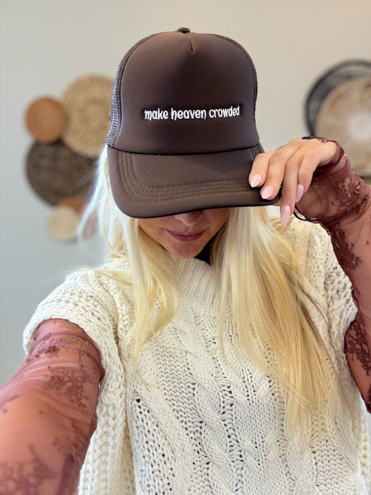 The Make Heaven Crowded Cap brings meaning to your everyday look with its warm brown tone and soft cream embroidery that shares a message of love and purpose. Designed with a structured front, breathable mesh back, and adjustable snap-back fit, it’s the perfect blend of comfort, faith, and effortless style.