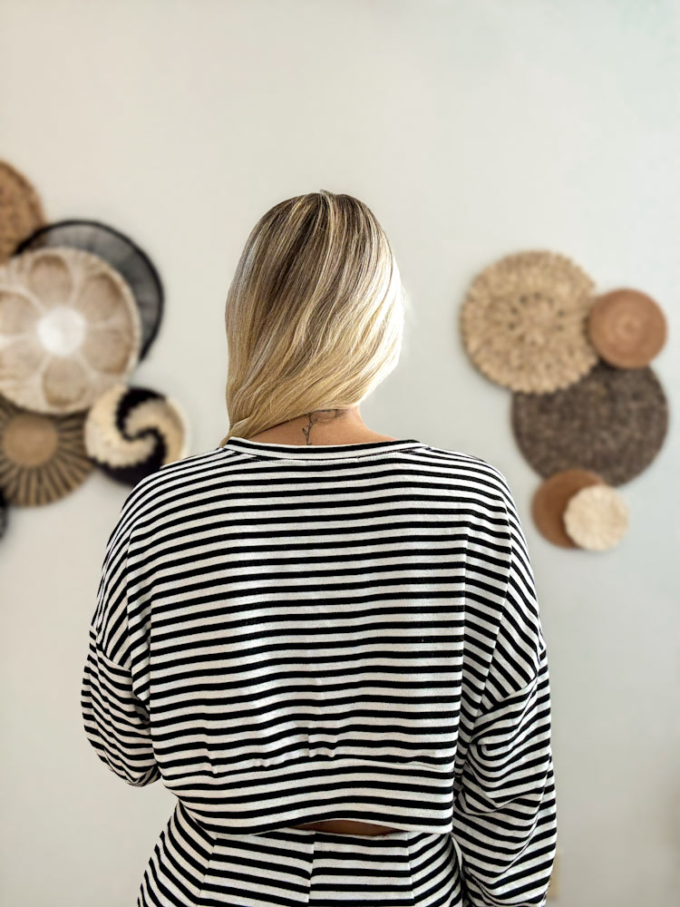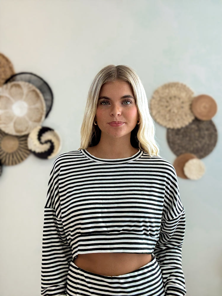 Keep it casual yet chic in the On The Line Cropped Top. Featuring a boat neckline, long sleeves, and a relaxed fit, this striped knit brings effortless style to your everyday wardrobe. The soft fabric drapes comfortably while the banded hem adds just the right touch of structure for a polished finish.