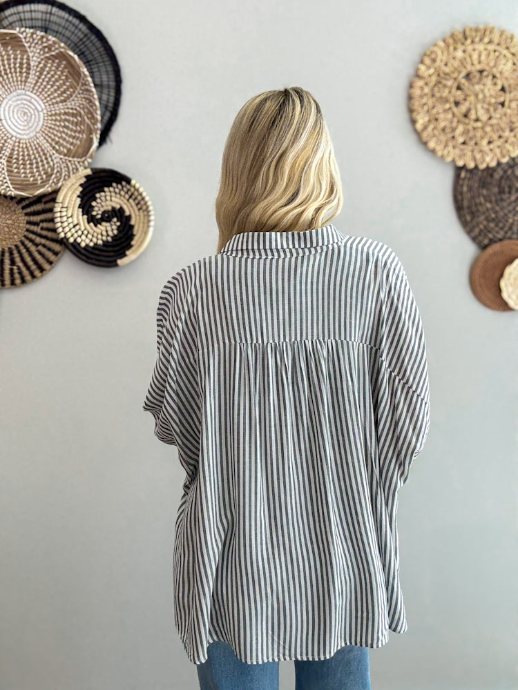 Designed for the woman who loves an oversized fit that still looks put-together, this button-up features lightweight rayon fabric, a relaxed silhouette, and vertical stripes that add just the right amount of energy to your look. Material Content: 100% Rayon.