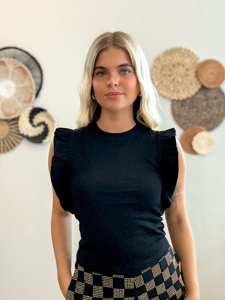 The fitted silhouette keeps things sleek, while the statement ruffle trim along the shoulders adds just the right touch of feminine flair. Made with a soft, stretchy knit, it moves with you and keeps its shape all day long.